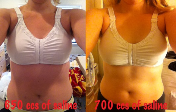 Stopping at 700 ccs was fine with me; I’m (at last) happy with the projection of my tissue expanders. You can’t see much of a difference between 650 ccs and 700 ccs, but here’s a comparison: