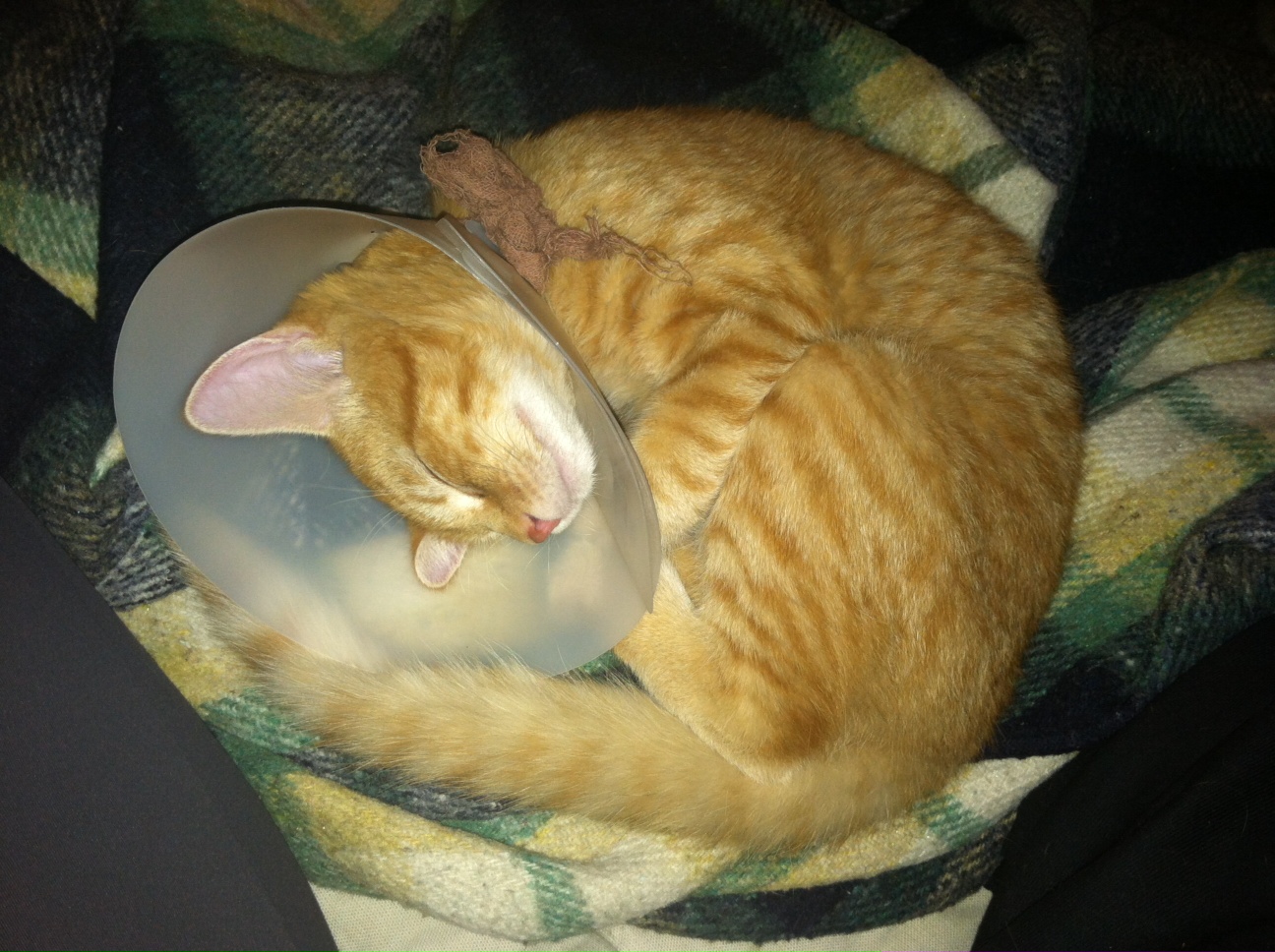 I picked him up this afternoon and he seems to be doing just fine. Here he is, Cone of Shame and all. He is now, in my parents’ words, a consultant.